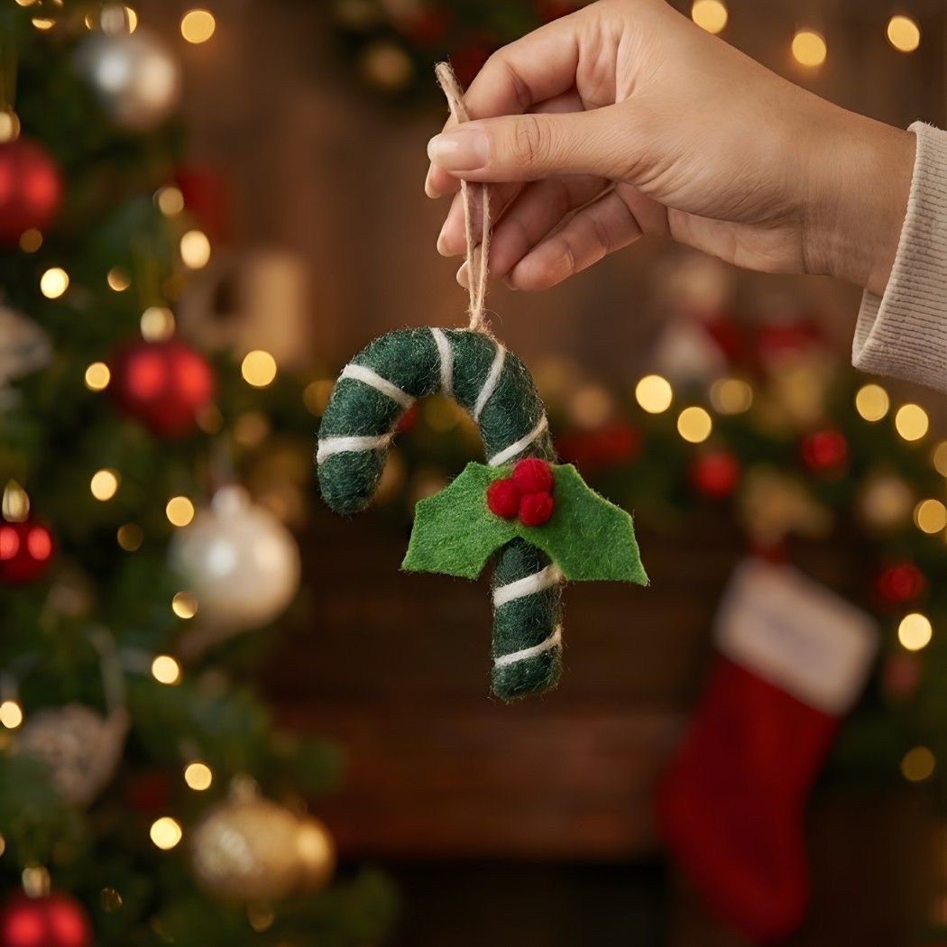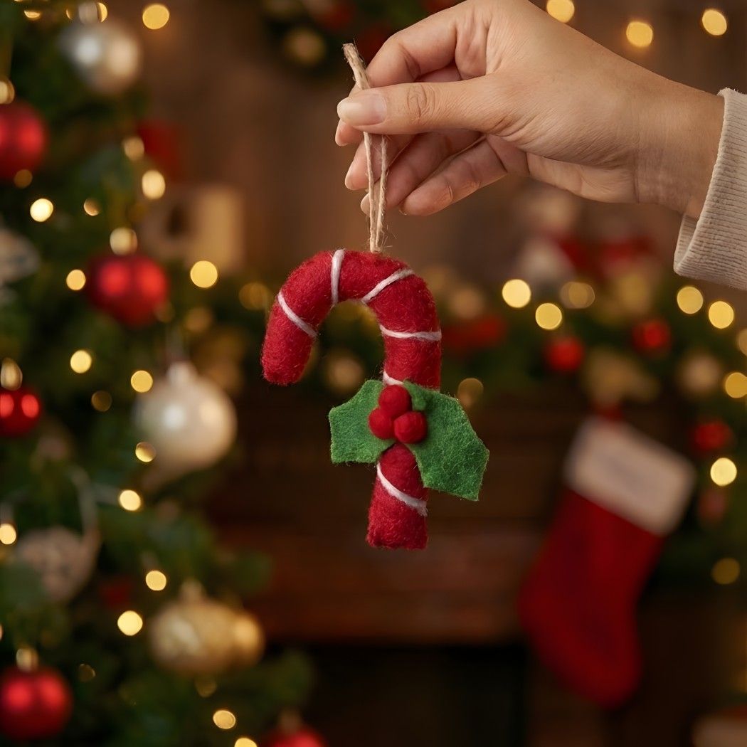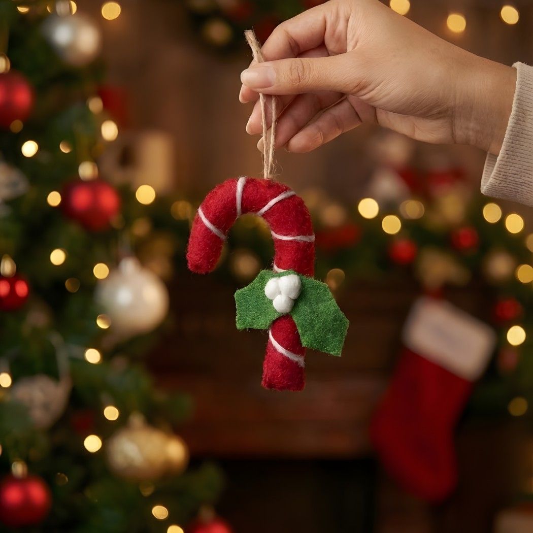 Bring a touch of cozy, traditional charm to your holiday decor with this Set of 3 Felt Candy Cane Ornaments by Glimpse Homes. Handcrafted from soft, durable felt and detailed with festive holly leaves and berries, these unbreakable decorations offer a warm, rustic look.