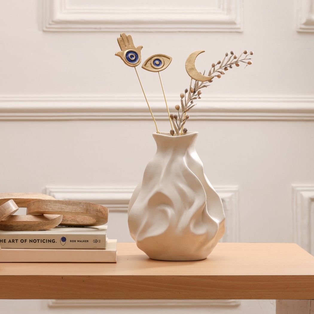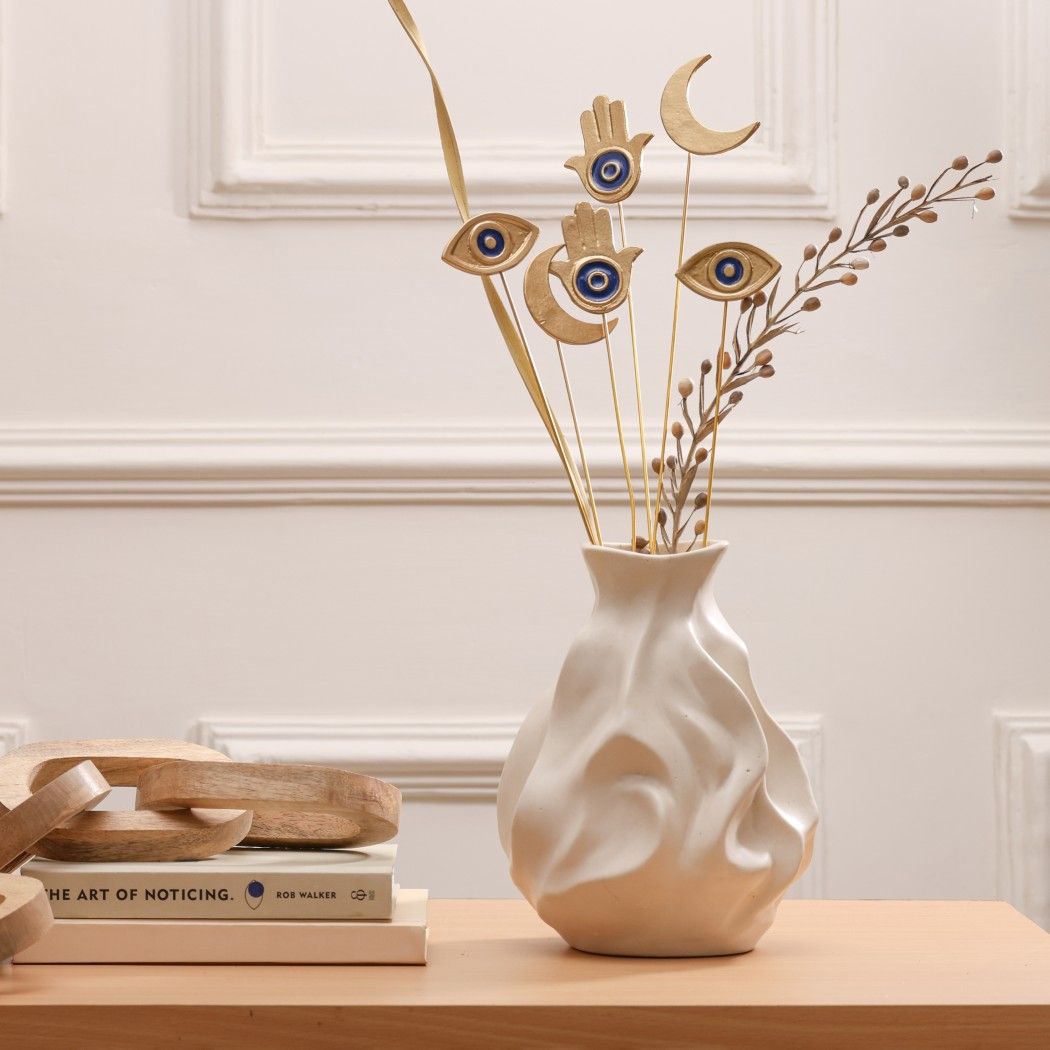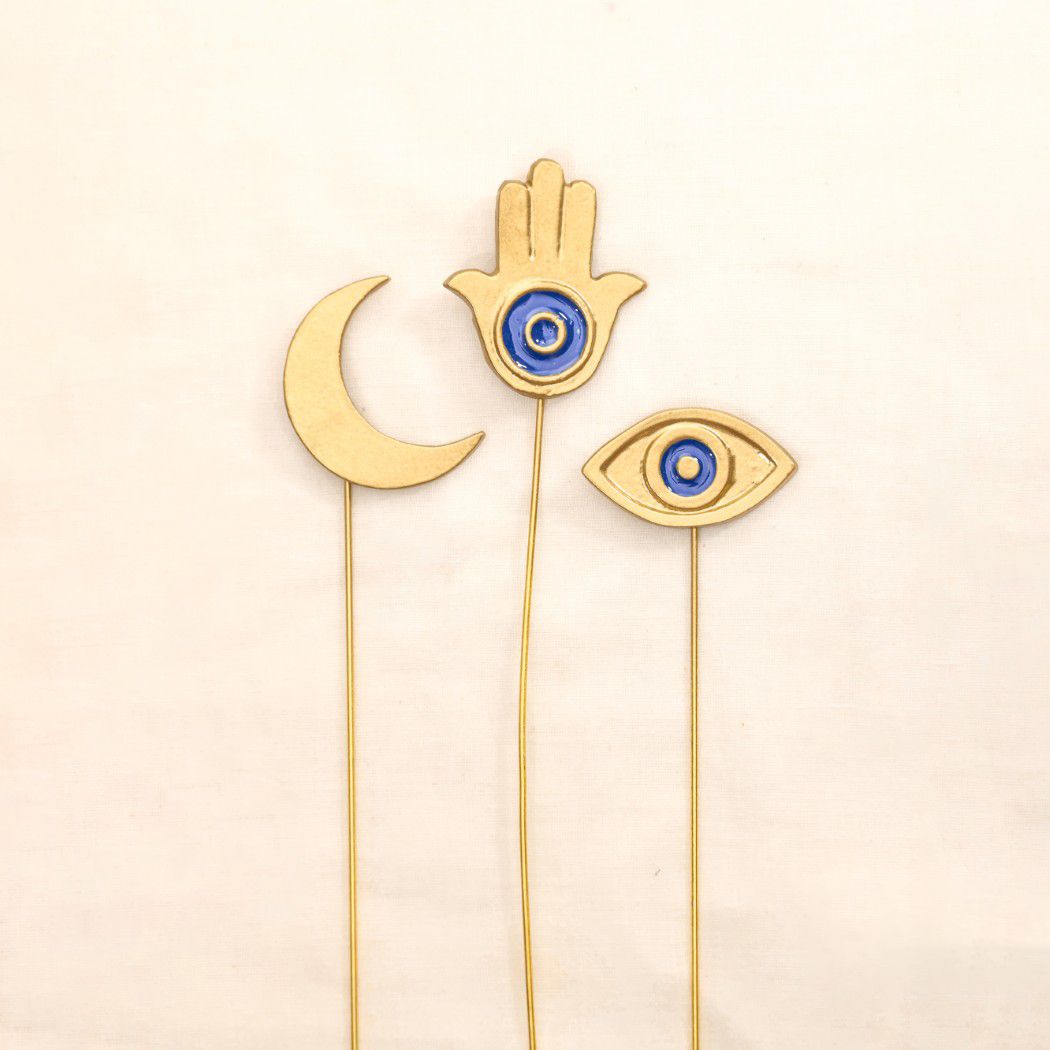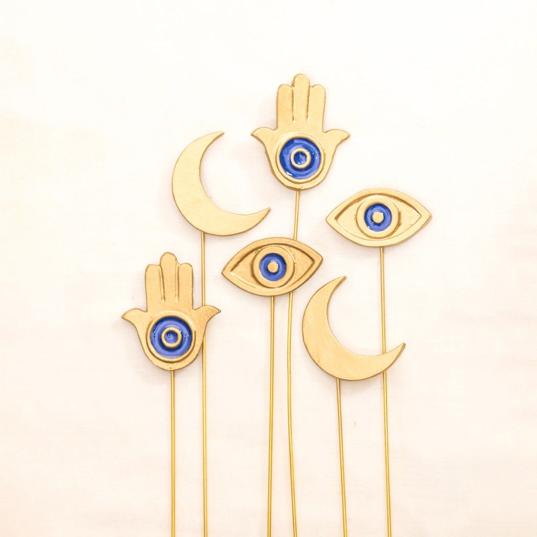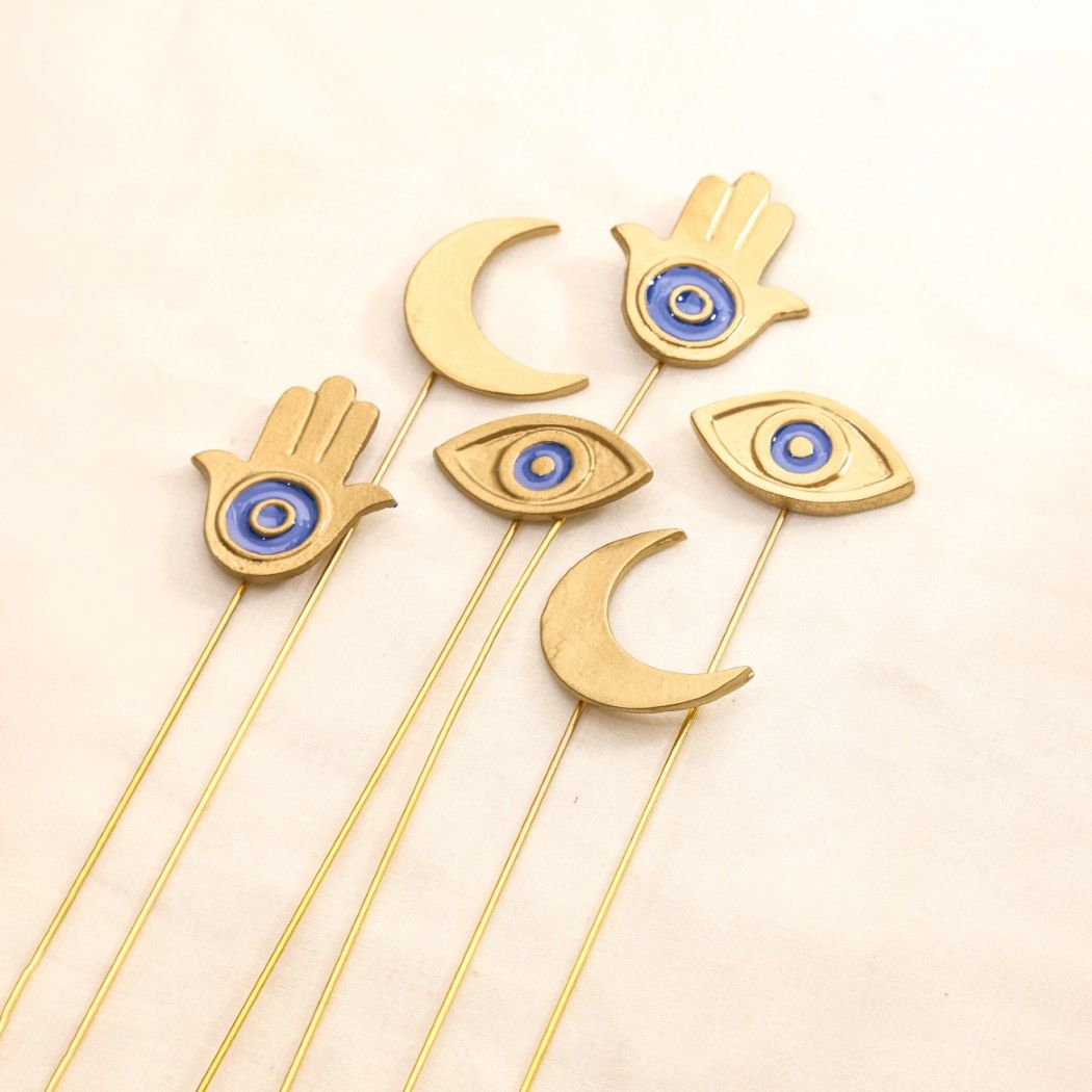 Glimpse Homes introduces The Golden Persian Charm Metal Sticks featuring the protective Hamsa Hand, the watchful Evil Eye, and the celestial Crescent Moon. These premium vase fillers are crafted from aluminium and are bendable, allowing you to adjust the height and angle to perfectly fit your vase.